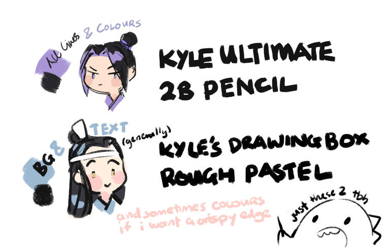 I work exclusively in Photoshop CS6 with Kylebrush presets on a Wacom Intuos Pro (Medium). I pretty much use just two brushes- shown below!